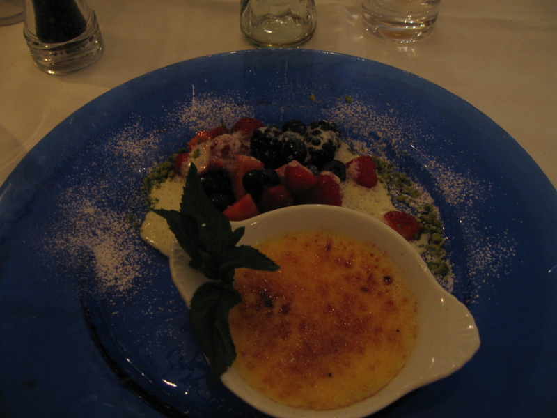 The beef was very tender and the sauce was delicious. I wasn’t going to have any dessert, but when the server brought the menu I saw a dessert that had fresh berries that sounded delicious so I decided to go for it. It turned out to be creme brulee with fresh raspberries, blackberries, strawberries and blueberries. It was the best creme brulee I have ever had. The images