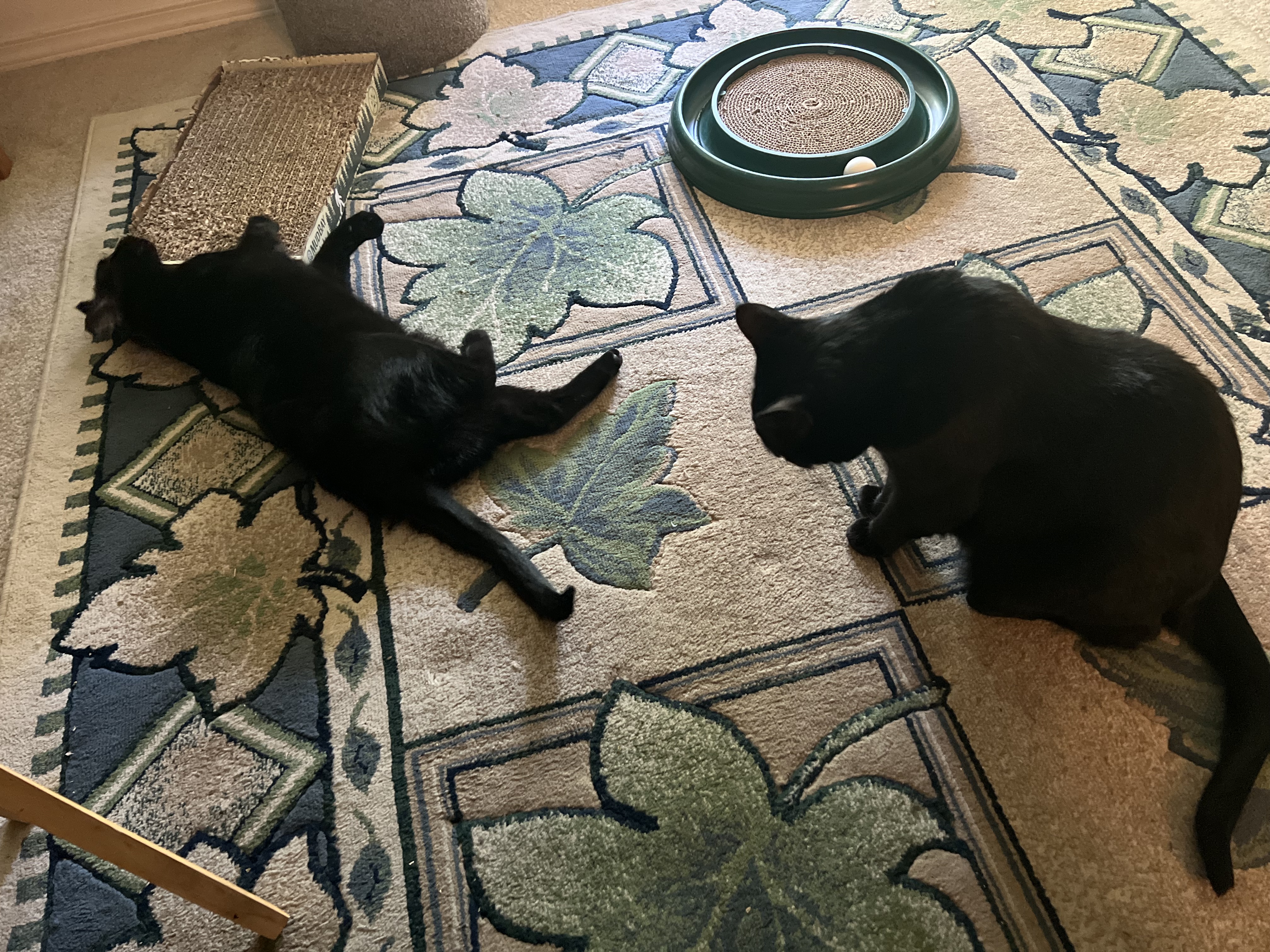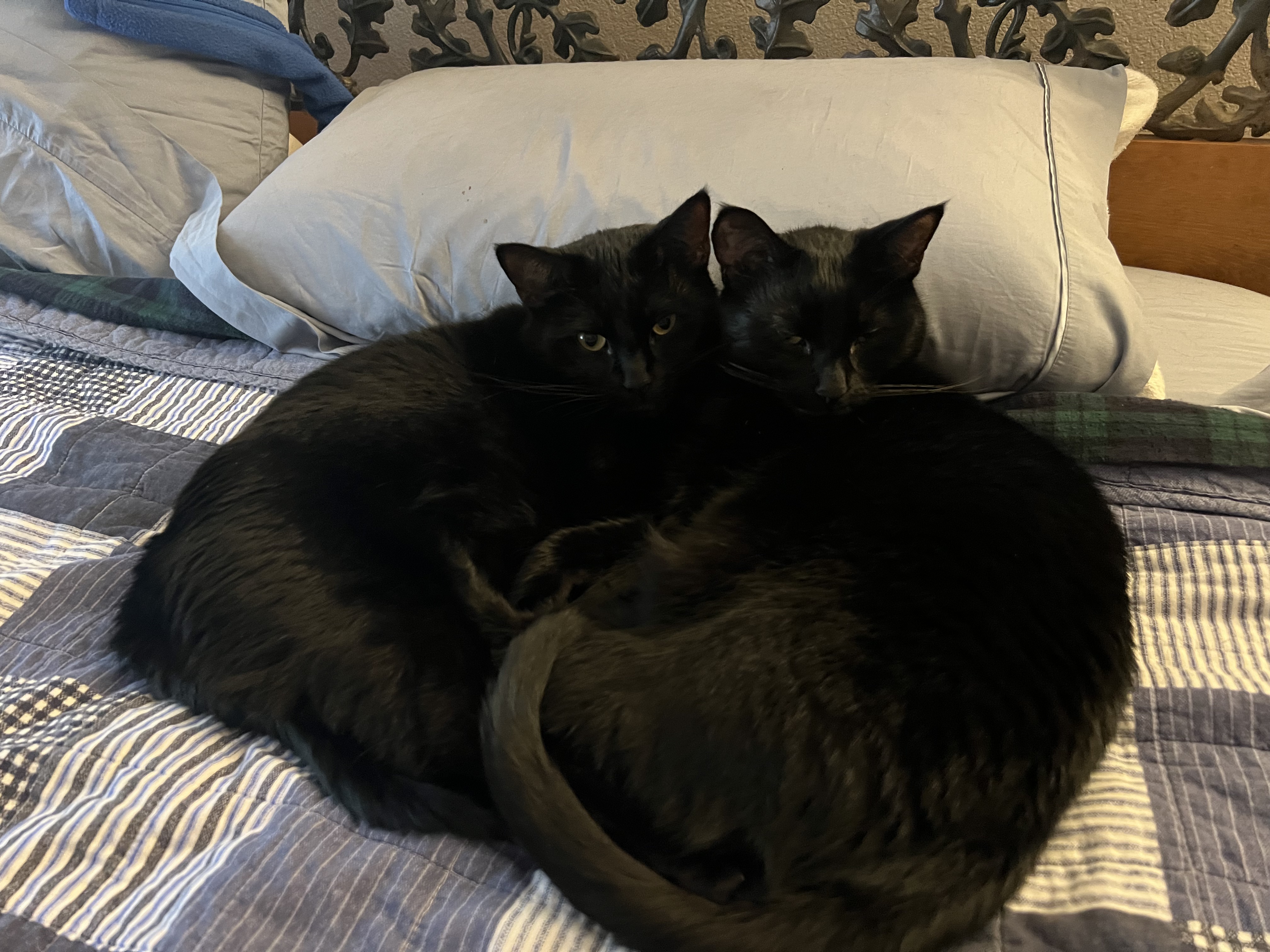 They never became super cuddly with Buto, although they did sleep near her a few times. Buto was clearly the alpha cat while she was alive and was always on my lap or chest. Neither Sable or Raven sit in my lap but they do sleep with me throughout the night and love getting scritches.